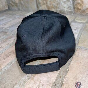 Black strap-back cap is adjustable with velcro to fit most adult sizes