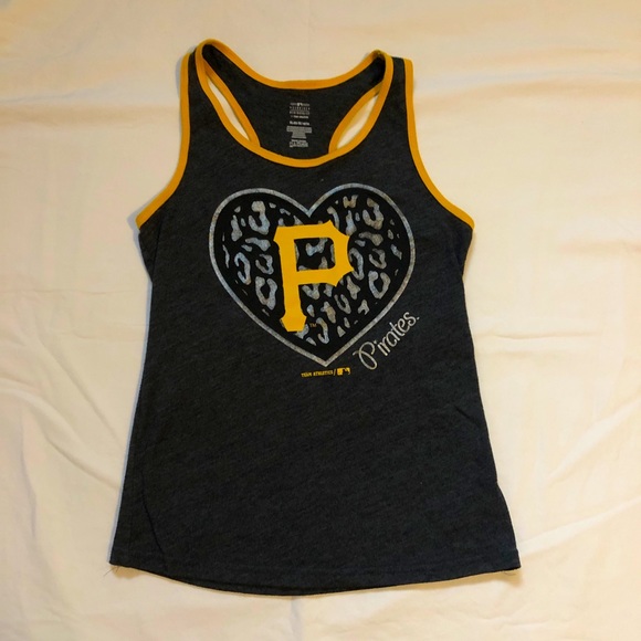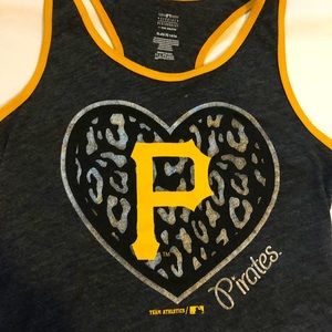 Pirates razor back tank top. Kids size XL 14/16 but would also fit adult XS. 50% Polyester 38% Cotton 12% Rayon.