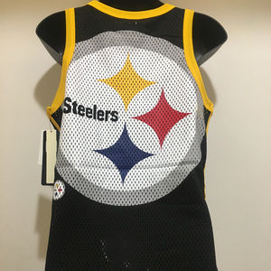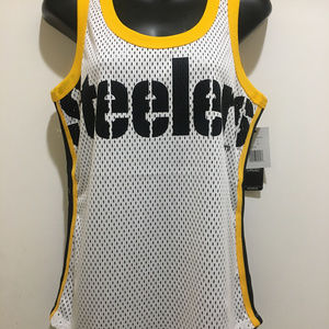 Pittsburgh Steelers Ladies Mesh Tank Top - TOUCHBACK Tank by G-III - NFL Licensed Material: 100% Polyester TOUCHBACK Mesh Tank Top by G-III White front panel/primary team color back panel Secondary team color neck and armhole binding Secondary/primary team color yarn dye striped flat knit taping down sides Center front softhand ink screen print at center chest with oversize full color team logo printed at back panel Brand: G-III Size: M to 2XL