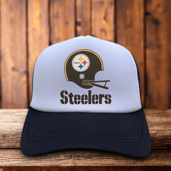 Pittsburgh Steelers Mens Trucker Hat Black 80s Retro Helmet Logo Football Cap