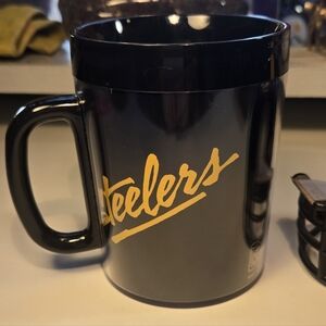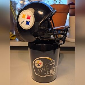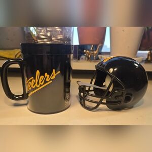 This is a Pittsburgh Steelers mug, and a Steelers football helmet 3M scotch tape dispenser. Includes a roll of tape. Mug holds 8 ounces. Both Steeler items in very good condition.