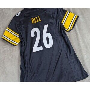 Show your support for the Pittsburgh Steelers with this officially licensed, Nike black #26 LeVon Bell jersey. Perfect for young fans, this unisex children's jersey is a size medium and features the team's iconic logo on the front. Great for game day or any day, this football jersey is a must-have for any Steelers fan. Represent your favorite team with this Pitsburgh Steelers NFL jersey featuring LeVon Bell's name and number. Made with high-quality materials, this jersey is perfect for any football-loving fan. Show off your team spirit and support your favorite player with this stylish and comfortable jersey.