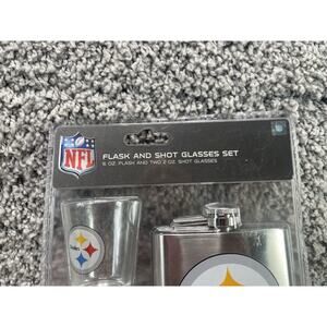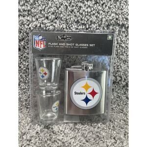 This 3-piece Pittsburgh Steelers NFL Stainless Steel Flask & Shot Glasses gift set is the perfect present for any football fan. The set includes a 6 fl oz flask and two 2 fl oz shot glasses, all made of stainless steel with a transparent color. Officially licensed by the NFL, this set features the iconic Pittsburgh Steelers team logo, making it a must-have for fans of the team. The unisex adult set is great for enjoying your favorite football season beverages in style. Made in China, this set is a great addition to any Steelers fan's collection.