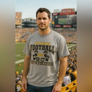 Celebrate a pivotal moment in Steelers history with this 2010 “Rev’n For Seven” Pittsburgh Steelers T-Shirt by Gildan, size XL. This rare gray tee features standout graphics of iconic players including Polamalu #43, Mendenhall #34, Roethlisberger #7, Harrison #92, Wallace #17, and Miller #83. With “Pittsburgh Football, Rev’n For Seven” emblazoned on the front, it’s a tribute to the team’s legendary Super Bowl push. Crafted from a soft and durable 90% cotton, 10% polyester blend, it offers a comfortable fit with a 24” chest and 25” length—ideal for game day, tailgates, or casual wear. A must-have for collectors and die-hard fans alike!