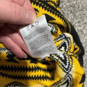 This Pittsburgh Steelers sweater vest in size M is an officially licensed NFL fan apparel featuring an ugly Aztec logo design, perfect for Christmas or any occasion. Made for men, this black sweater vest represents the National Football League team with pride. The product is designed for the regular season and is ideal for showcasing team spirit while staying stylish. Made in China, this sweater vest is a must-have for Pittsburgh Steelers fans looking to add a unique and festive touch to their game day attire.