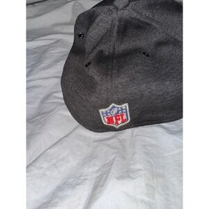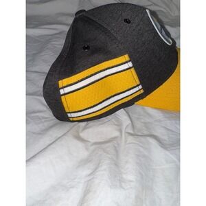 Pittsburgh Steelers New Era 39th Thirty gray baseball cap. The front has the Steelers logo patch. One side features a yellow and black stripe textured detail. The hat is more of a fabric microfiber fabric. It is not wool. Yellow bill on a charcoal gray hat.