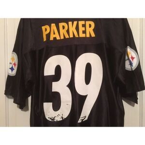 PITTSBURGH STEELERS WILLIE PARKER SIZE MEDIUM JERSEY. 22" ARMPIT TO ARMPIT, 31" LONG. SCREENING ON NUMBER ON BACK IS BAD, SEE PHOTOS.
