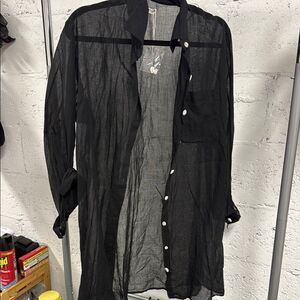 This Pitusa black lightweight shirt jacket offers a relaxed fit with a semi-sheer fabric, perfect for layering. Its long length and classic design make it a versatile addition to any wardrobe, ideal for both casual and chic occasions.