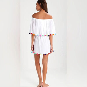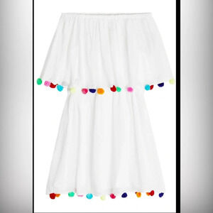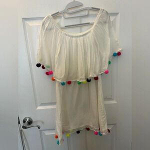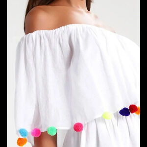 In perfect condition Pitusa, a vibrant and playful piece that embodies the spirit of festivals and sunny beach days alike. This dress effortlessly blends comfort, style, and fun with its eye-catching design and versatile functionality. A standout feature of this dress is the delightful rainbow pom pom trim adorning its edges. These colorful and whimsical pom poms infuse the garment with a sense of festivity and joy, making it a perfect choice for vibrant festivals or beach vacations. Elastic neckline and waist, lined. No rips, stains or pulls, missing one pom. Size os Measurements