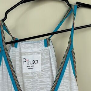 Elegant white dress with vibrant blue accents. Ideal for summer wear.