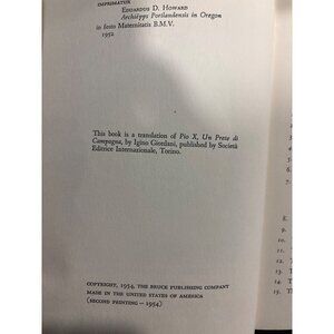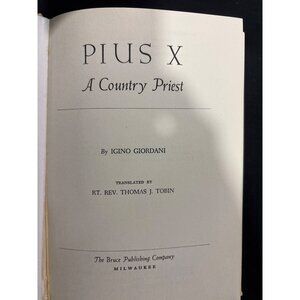 This is a 1954 second printing of Pius X: A Country Priest by Igino Giordani, translated by Thomas J. Tobin, and published by The Bruce Publishing Company (Milwaukee, USA).