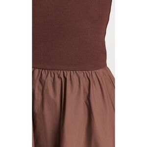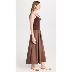 Featuring a scoop neckline, sleeveless design, a fitted jersey bodice, and a lightweight poplin skirt. Midi length. Pull-on style. Subtle trim detailing at edges. Material: Shell 100% Cotton, Trim 95% Cotton, 5% Spandex. Fits true to size