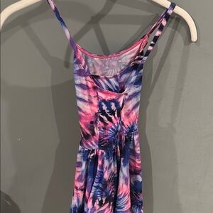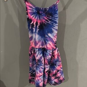 Vibrant Tie-Dye Swirl Dress with Criss-Cross Straps. This fun and colorful dress features a lively tie-dye pattern with swirls of bright pink, blue, and purple. It has a fitted bodice with delicate criss-cross spaghetti straps and a flared, gathered skirt, creating a playful and comfortable silhouette. Perfect for summer days, casual outings, or adding a burst of color to any wardrobe!
