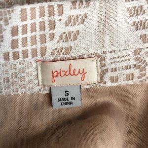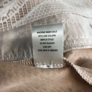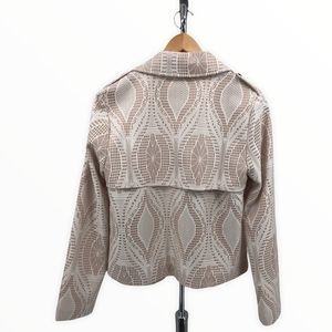 Beautiful closure free jacket blazer, featuring an ivory lace overlay and nude lining. Long sleeves, collared, placket across back, front pockets, tags at shoulders.