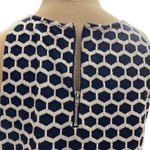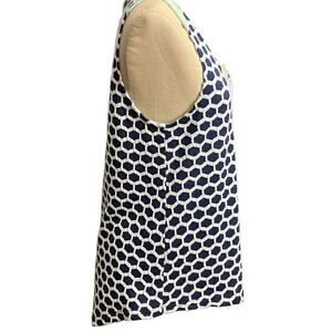 Delightful scoop neck, sleeveless top. The textured geometric shapes give this shirt depth, and has a hi/lo hem.