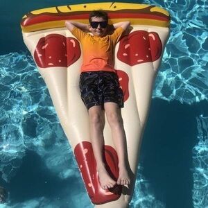 It'll be extra fun to float around in the pool on your very own Pizza Slice Float from Sun Squad™. This inflatable pool float comes in a triangular shape that's 5 feet 10 inches long, comfortably fitting one person for a leisurely float in the water. The top of this inflatable pool toy is decorated to look like a delicious slice of pizza, complete with light yellow cheese, a sprinkling of printed toppings and a golden brown crust design near the top. Plus, the inflatable design means this pizza float can be deflated when not in use for compact and convenient storage with your other outdoor toys.