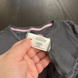 Soft gray pajama top with button detail. Embroidered 'Love' on chest. Comfortable and stylish for lounging.