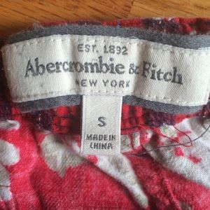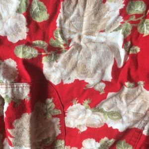 Red with tan flower pattern. Velvet waist tie and elastic waist band with pockets