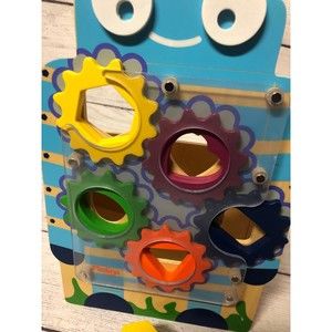 Children loved to learn about shapes and colors with this fantastically funky shape sorter. Rotate the gears, line up the shapes, then slide the blocks through. Blocks drop inside the jet pack back with a funny clunky sound and then slide out the side to keep the play going. Helped to improve fine motor skills and develop shape and color recognition.