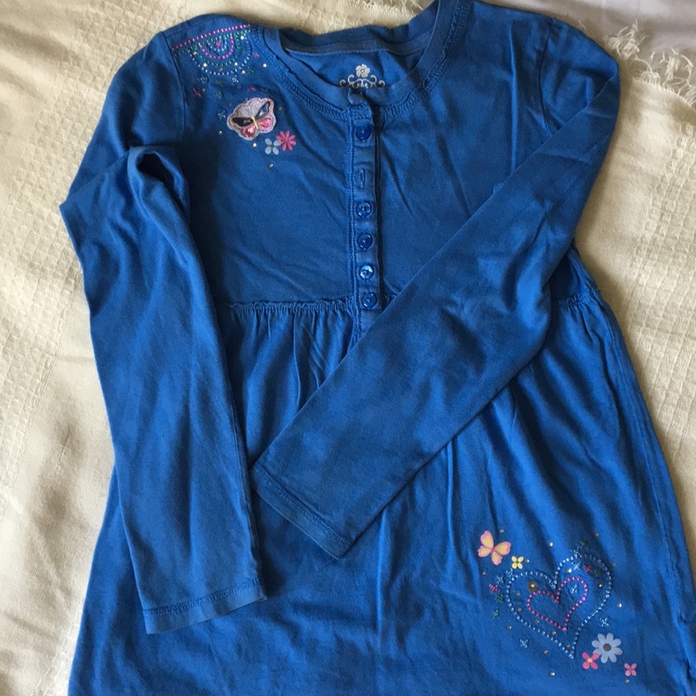 Long sleeve blue shirt. Umpire style 6 button front. Pretty heart and butterfly deco. Good condition. A little discoloration on sleeve shown in picture.