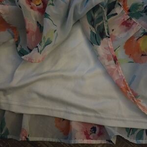 Vibrant floral dress with blue and orange hues. Lightweight and stylish with cold shoulder flutter sleeves.
