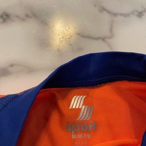Excellent Quality Place Sports Rash Guard. Orange in color with Dark Blue Short Sleeves, Collar and Accents. Says, “Great White’s California Shark Patrol, on it.