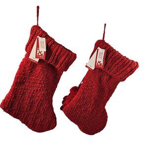 Pair Red Knit Hanging Holiday Christmas Stockings
