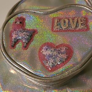 Pre-owned in good condition. Silver holographic backpack with a heat pocket on the front decorated with a Llama, heart and the word LOVE. No lining issues.