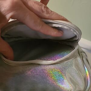 Pre-owned in good condition. Silver holographic backpack with a heat pocket on the front decorated with a Llama, heart and the word LOVE. No lining issues.