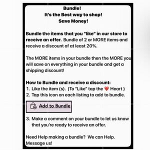 Bundle with other items from our closet to save on shipping. If you need help or have questions on how to bundle, please ask. We are here to help. Bundles of 2 or more items typically are eligible for a price and shipping discount .