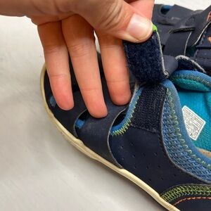 Quality construction make these fisherman sandals the perfect closed toe sandal for kids on the go. Sandal does show general wear consistent with normal use: discoloration to surfaces and light scuffing. No structural flaws. Plenty of life left in the wonder play shoes. See all pix for full scope of condition.