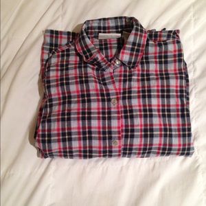 Liz claiborn, cropped sleeves. Super cute for the summer. Also looks good buttoned completely up.