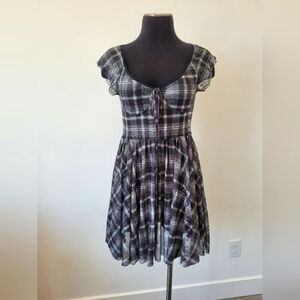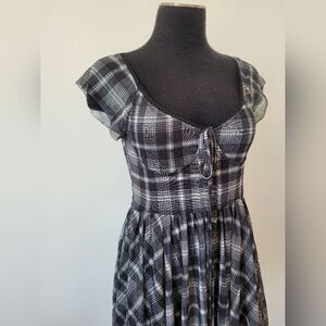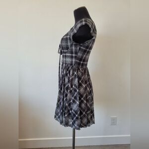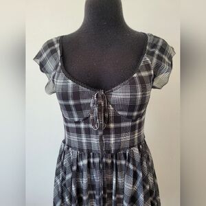 Very cute and flattering skater style dress. Black and white plaid print with a sweetheart style neckline and babydoll bodice. The overlay is sheer mesh with lining underneath. Great condition. Size medium measures approximately 32 inches long 15.5 inches underarm to underarm laid flat 28 inch waist.