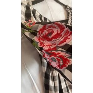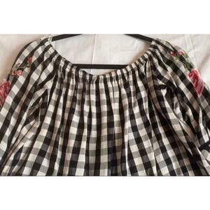 Details: Long sleeve, bell sleeves, boat neck, elastic around neck, can be pulled off shoulder, embroidered flowers on sleeves, plaid