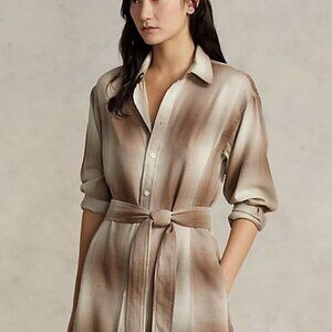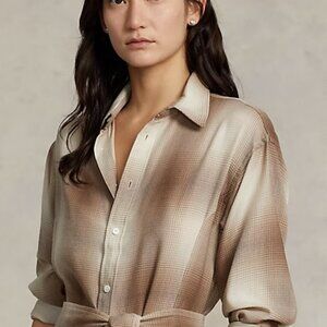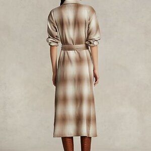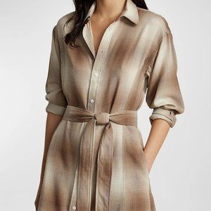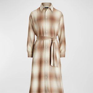 An ombré-inspired plaid motif gives this Italian wool garbadine shirtdress a soft gradient, while a matching wrap-belt accentuates the waist of its A-line silhouette.