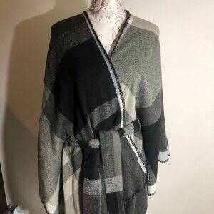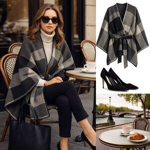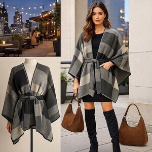 Elevate your layering game with this chic plaid belted wrap poncho. Featuring a bold black, gray & ivory geometric design, this versatile piece adds instant sophistication to any outfit. The matching belt cinches the waist for a flattering silhouette, while the open draped cut allows for easy layering over dresses, denim, or trousers.