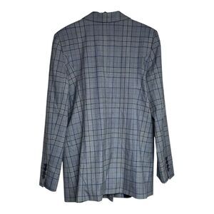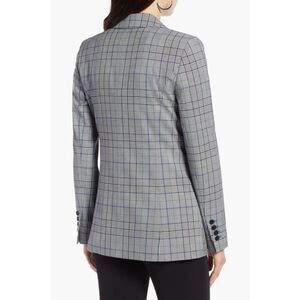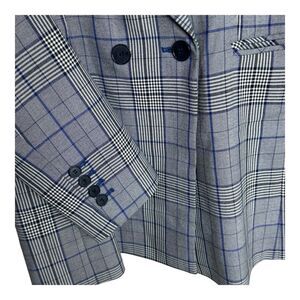 Keywords: plaid blazer, checkered blazer, double breasted blazer, women's blazer, gray blazer, blue blazer, career jacket, business casual, formal wear, office attire, plaid jacket, checkered jacket, womens jacket, smart casual