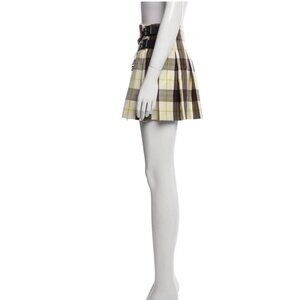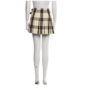 Stylish plaid skirt featuring a blend of brown and yellow. Perfect for any occasion.