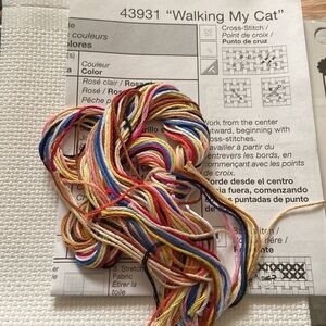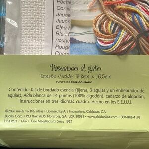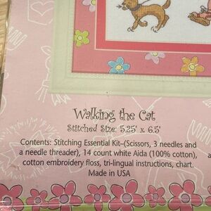 Plaid Bucilla Vintage 2006 So Girly Counted Cross Stitch Essentials Kit 43931. Theme is ‘Walking The Cat’, stitched size: 5.25” x 6.5”. Includes stitching essential kit- scissor, 3 needles, threader, 14 count white Aida 100% cotton embroidery floss, instructions and chart. Pictures shows what in the kit. New and never used.