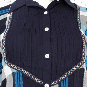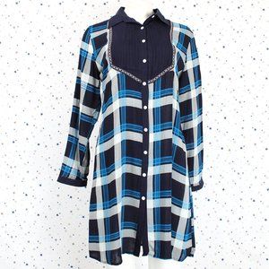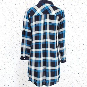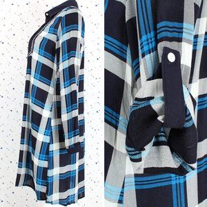 Plaid Button Down Dress 3/4 Roll Up Sleeve Blue Navy