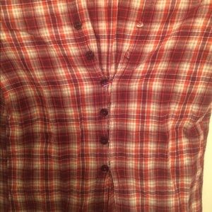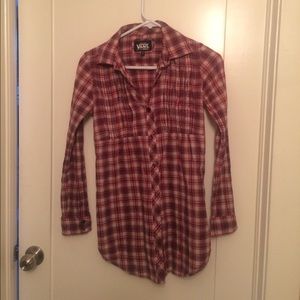 Red Plaid button up shirt. Could double as a dress with leggings for someone more petite.