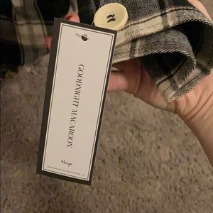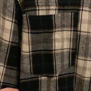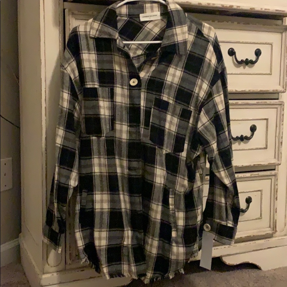 Long sleeve button up. Buttons on sleeve ends. Two pockets on front of shirt. Fringed edges. Size small. New with tags.