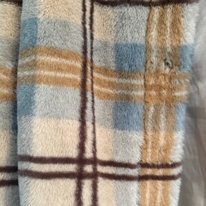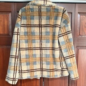 Cozy plaid faux fur jacket with button-up front. Features a mix of beige, blue, and brown tones. Very soft and cozy. Worn one time – in excellent condition.