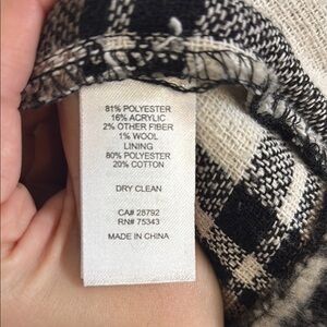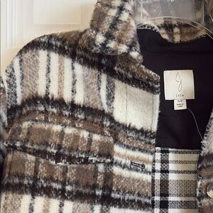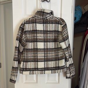 Stylish plaid jacket with button closure. Features a classic collar and two front pockets. Perfect for layering. Work maybe twice, in excellent condition.