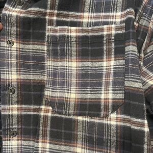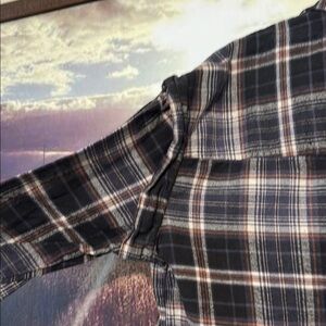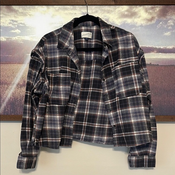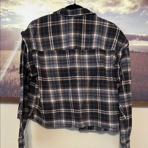 Plaid button-up, slightly cropped style.