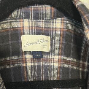 Plaid colors are dark navy, rust, cream