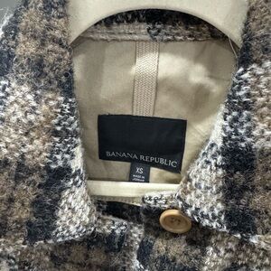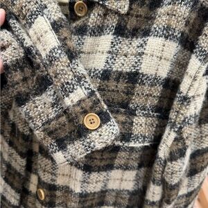 Stylish plaid button-up jacket. Features a mix of black, white, and tan colors. Size small. Oversized.
