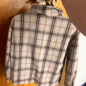 Stylish plaid button-up jacket with front pockets. Features a mix of cream, brown, and black colors.