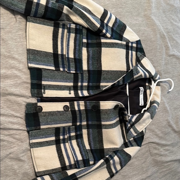 Stylish plaid button-up jacket with a classic design. Features a mix of cream, green, and black colors.