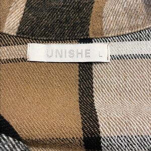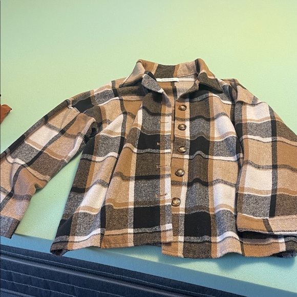 Stylish plaid button-up jacket with a classic collar. Features a mix of black, tan, and cream colors.